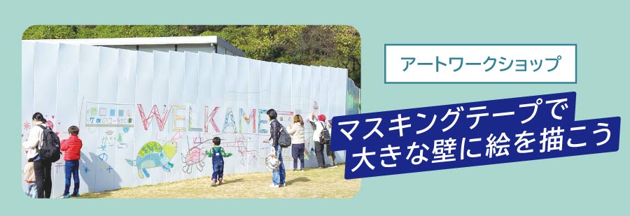 マスキングテープを使って全長50mの大きな壁にアートを制作するワークショップです。お子様から大人までご参加頂けます!
