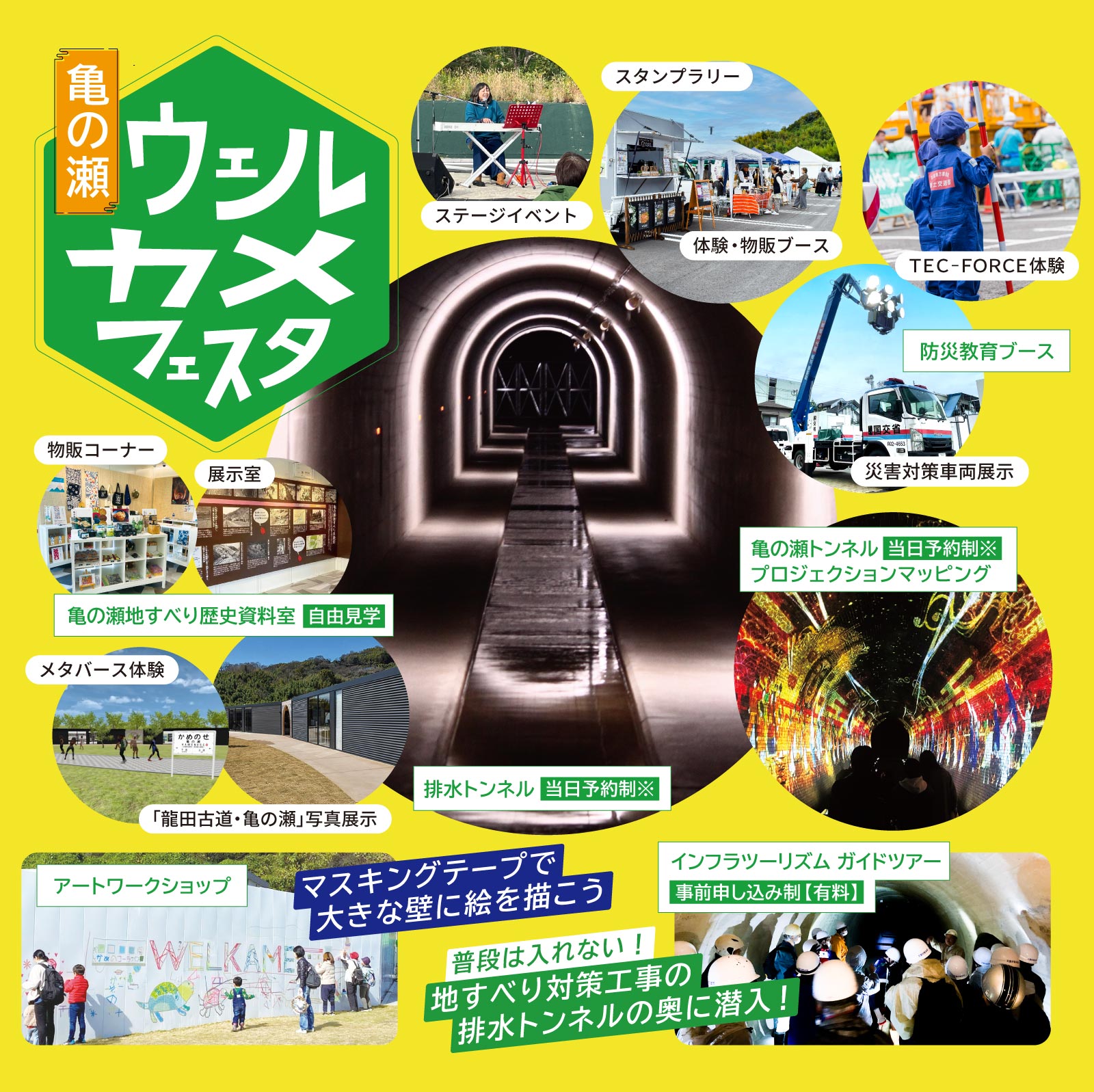 亀の瀬エリア周辺で、亀の瀬トンネル見学(予約制)やステージイベント、各種ブース等に加え、災害対策車両の展示や防災教育ブースなど盛り沢山。 一日楽しんでいただける内容です。